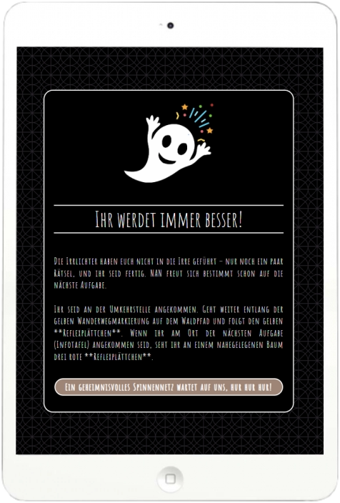 Auch daran haben wir gedacht – jede Aufgabe kann mit einem kleinen Fahnen-Symbol übersprungen werden. So bleibt ihr nicht stecken, sondern bekommt direkt die Karte zur nächsten Aufgabe.
